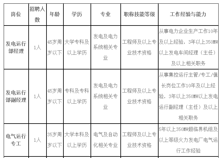 (三)發(fā)電運行部經(jīng)理、副經(jīng)理年齡在45周歲以下,其他崗位年齡在35周歲以下;