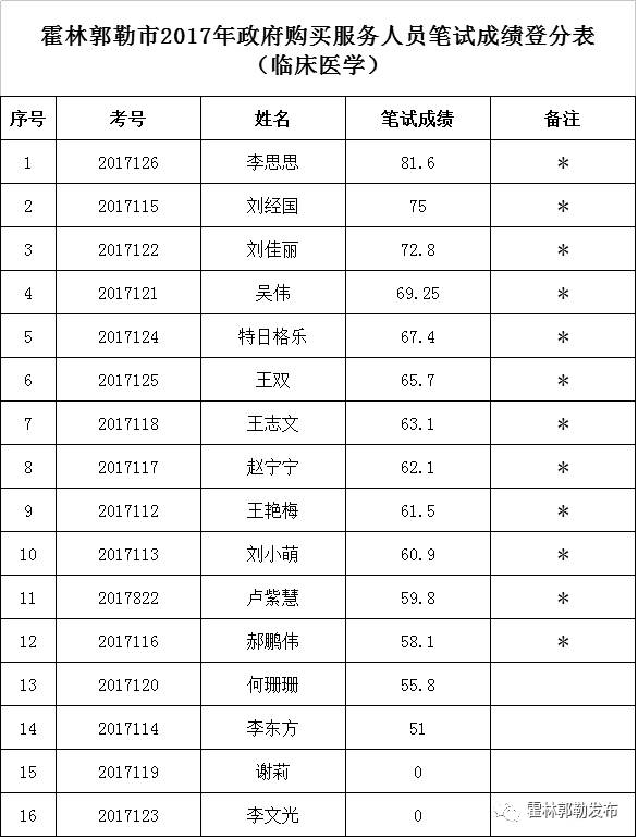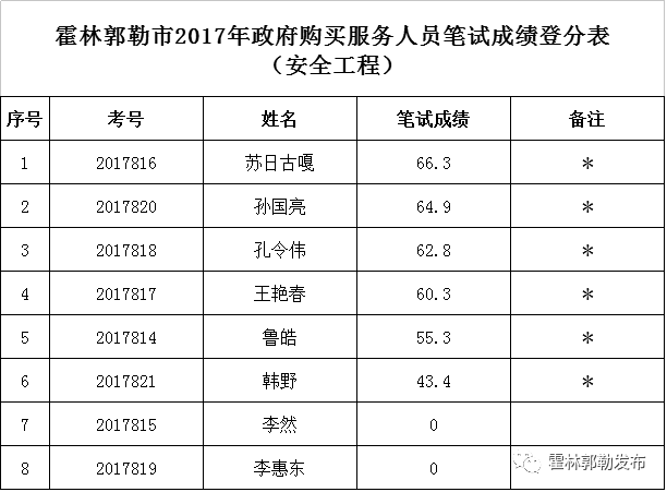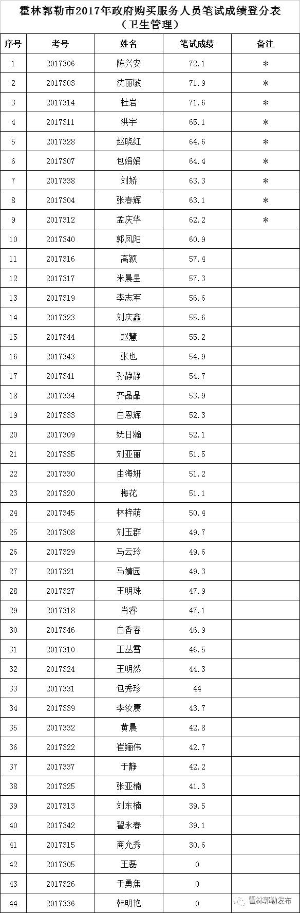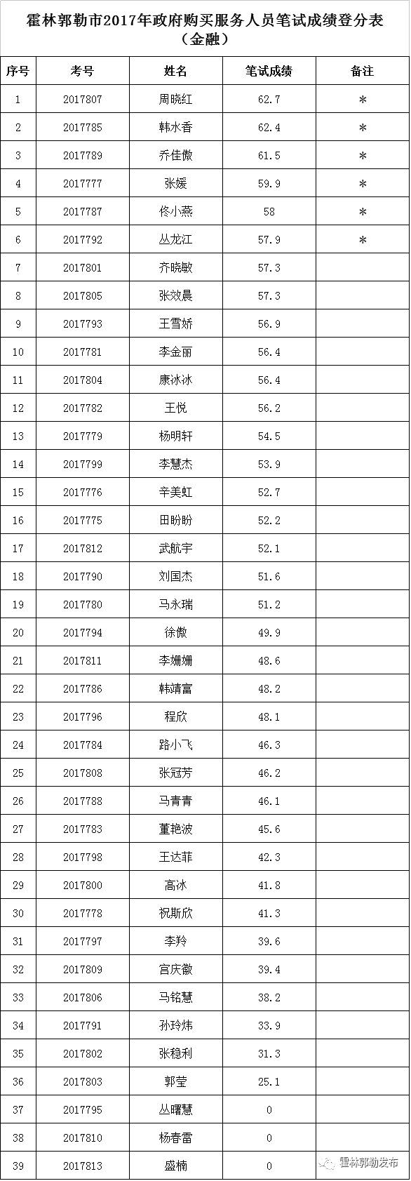 附件:霍林郭勒市2017年政府購買服務(wù)人員筆試成績登分表