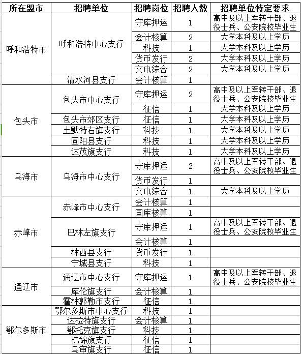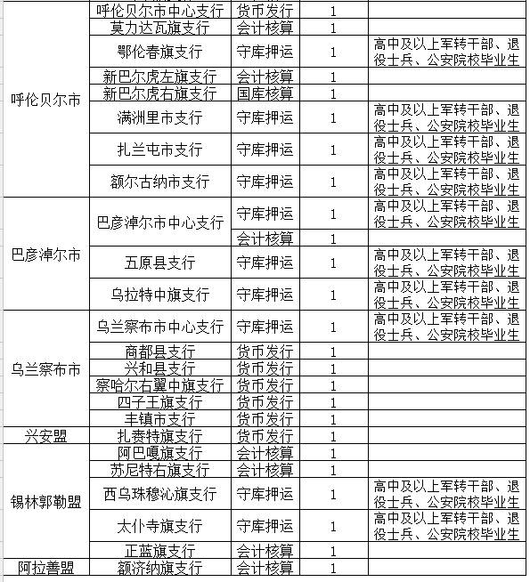 6、招聘單位另有特殊要求的,詳見(jiàn)《內(nèi)蒙古自治區(qū)人民銀行系統(tǒng)2017年業(yè)務(wù)操作崗位聘用制員工招聘簡(jiǎn)章》中“招聘單位特定要求”;