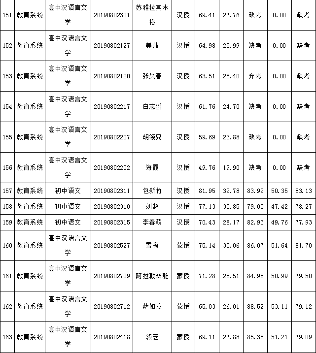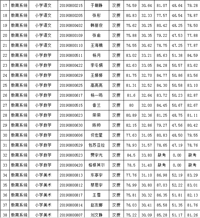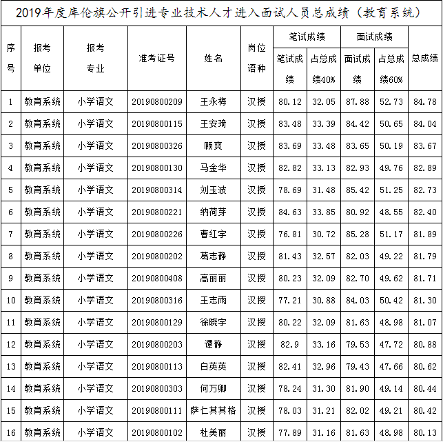 2019年庫(kù)倫旗公開(kāi)引進(jìn)專(zhuān)業(yè)技術(shù)人才進(jìn)入面試人員總成績(jī)公告如下: