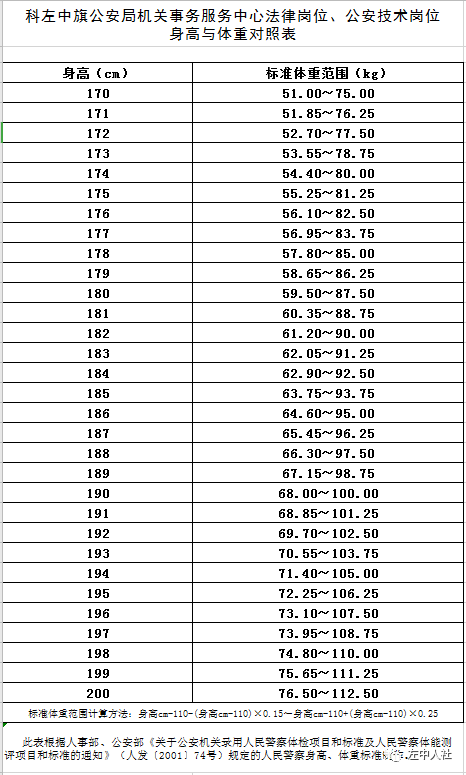 附件2:科左中旗公安局機(jī)關(guān)事務(wù)服務(wù)中心法律崗位、公安技術(shù)崗位身高與體重對照表