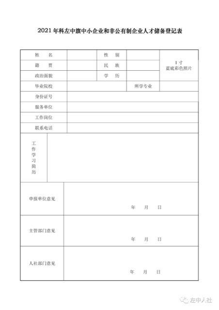 1.《2021年科左中旗中小企業(yè)和非公有制企業(yè)人才儲備登記表》(附件2),一式兩份;