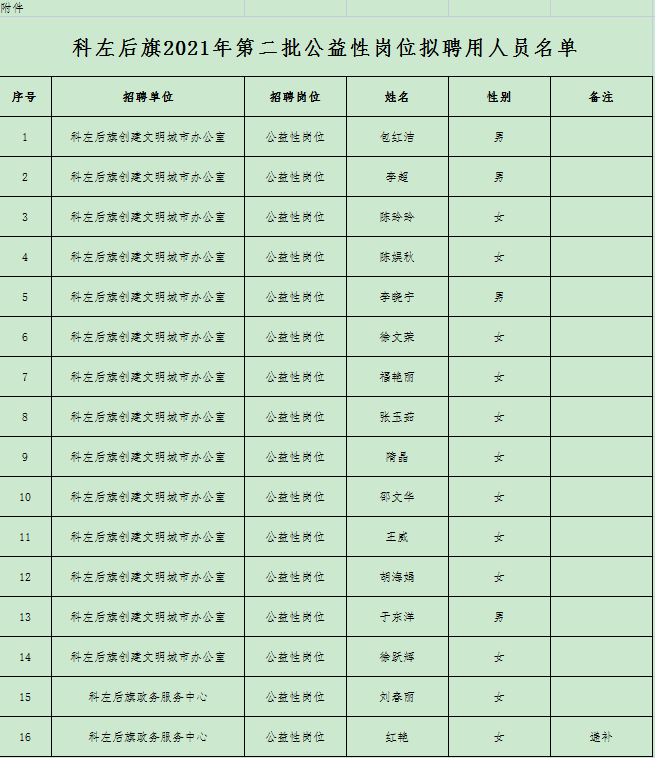 附件:科左后旗2021年第二批公益性崗位擬聘用人員名單