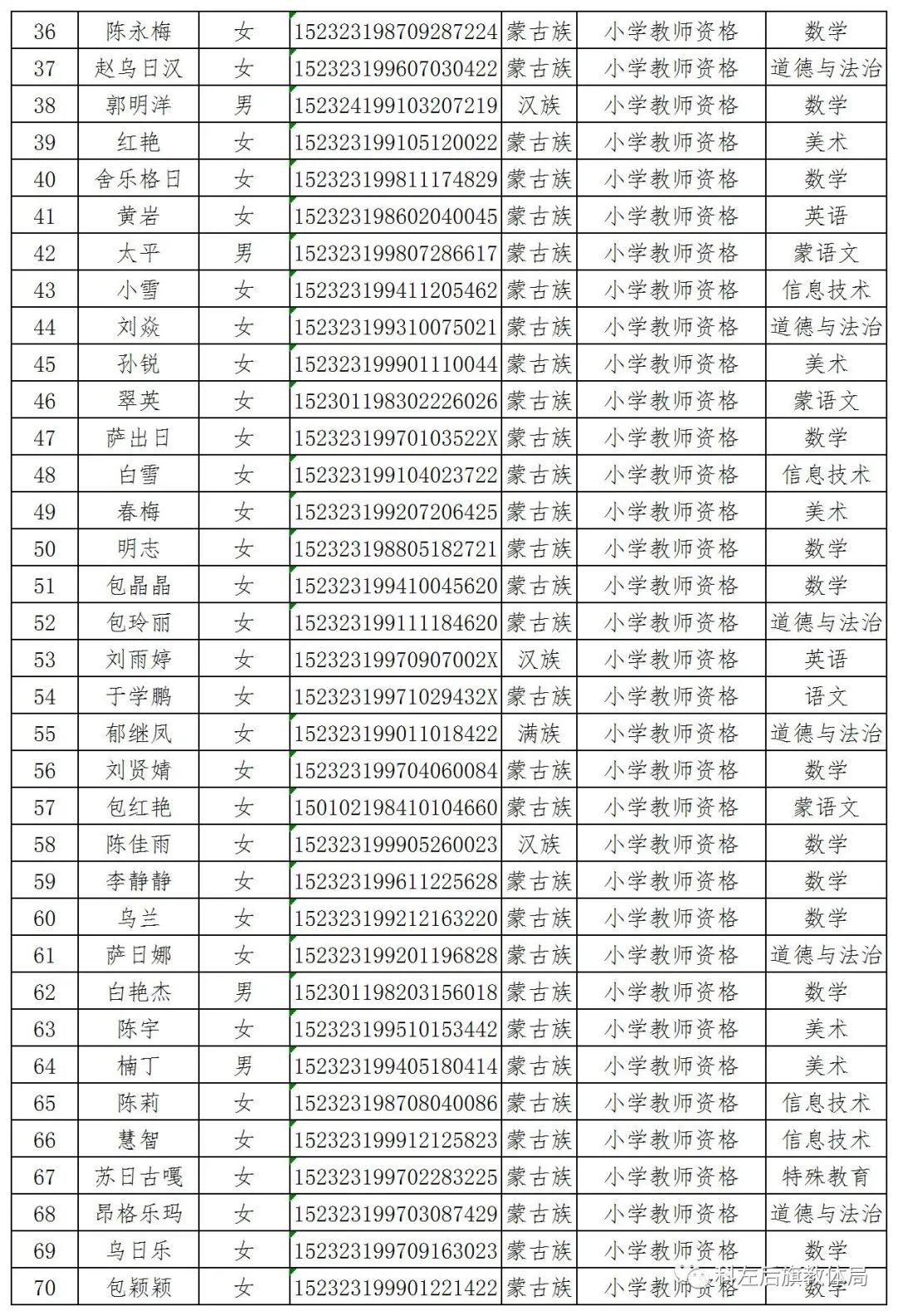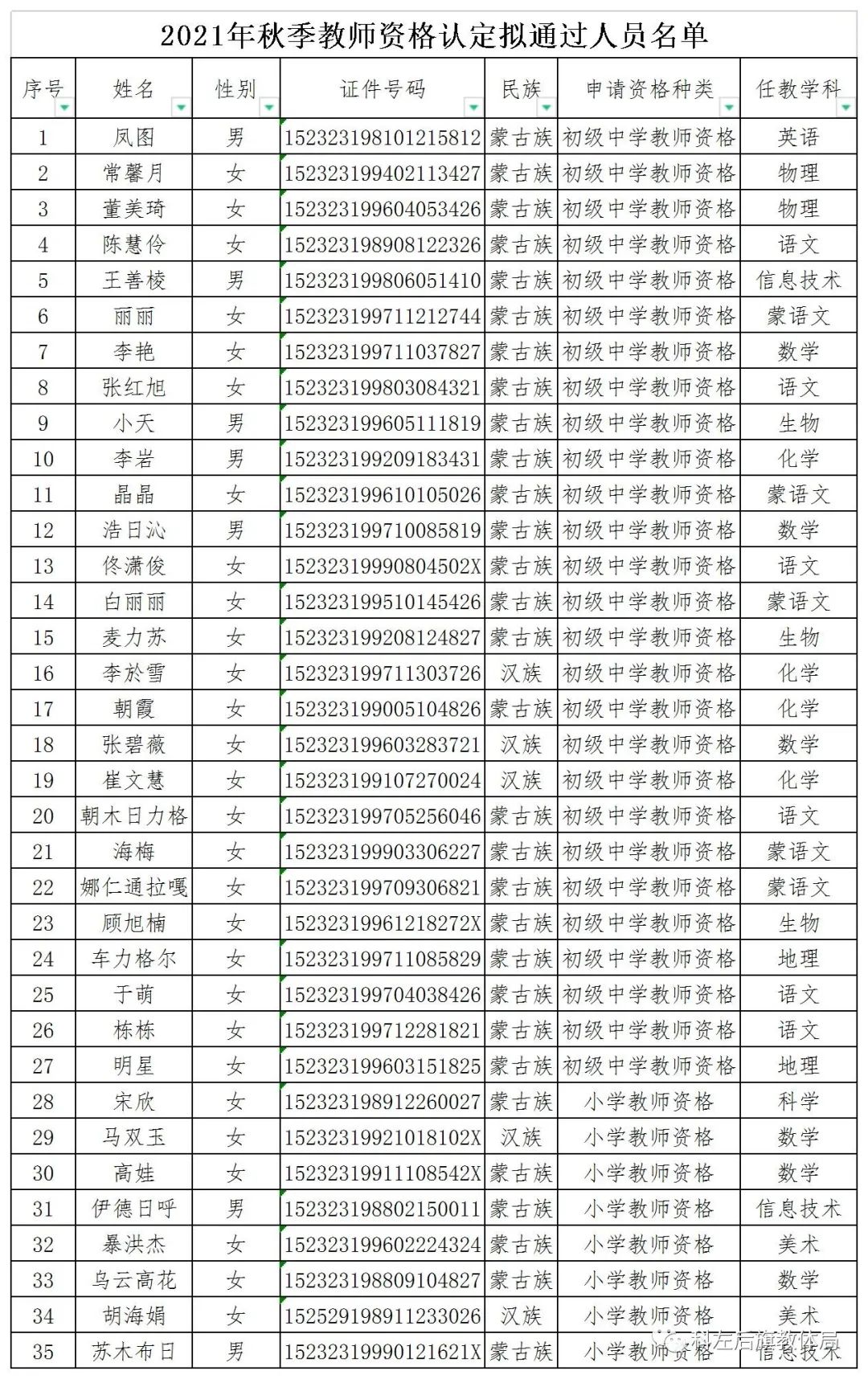 021〕96號)、自治區(qū)教育廳《內蒙古自治區(qū)2021年秋季中小學教師資格認定公告》和市教育局《關于做好2021年秋季教師資格認定工作的通知》(通教教師函〔2021〕144號)要求,為認真做好教師資格認定工作。2021年秋季經過網上報名、體檢、現(xiàn)場確認、非師范教育類人員教學基本素質和能力測試等核查程序,擬對以下95名教師資格申請人員給予認定,現(xiàn)將擬通過人員名單予以公示。公示期2021年12月10日至12月16日,如對認定結果有異議,請致電0475-5210116;0475-5226335。