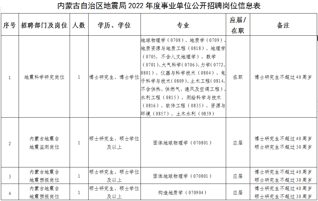 附:內(nèi)蒙古自治區(qū)地震局2022年度事業(yè)單位公開招聘崗位信息表