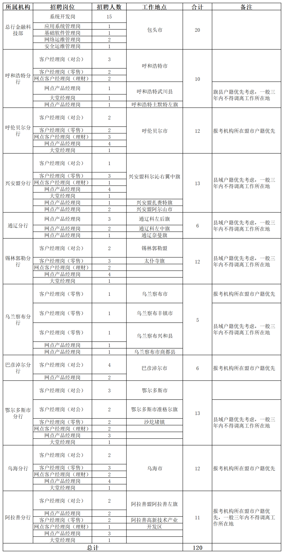 分行:網(wǎng)點(diǎn)產(chǎn)品經(jīng)理崗39人、客戶經(jīng)理崗(對公)21人、客戶經(jīng)理崗(零售)20人、網(wǎng)點(diǎn)客戶經(jīng)理崗(理財(cái)經(jīng)理)13人、大堂經(jīng)理崗7人,共100人。