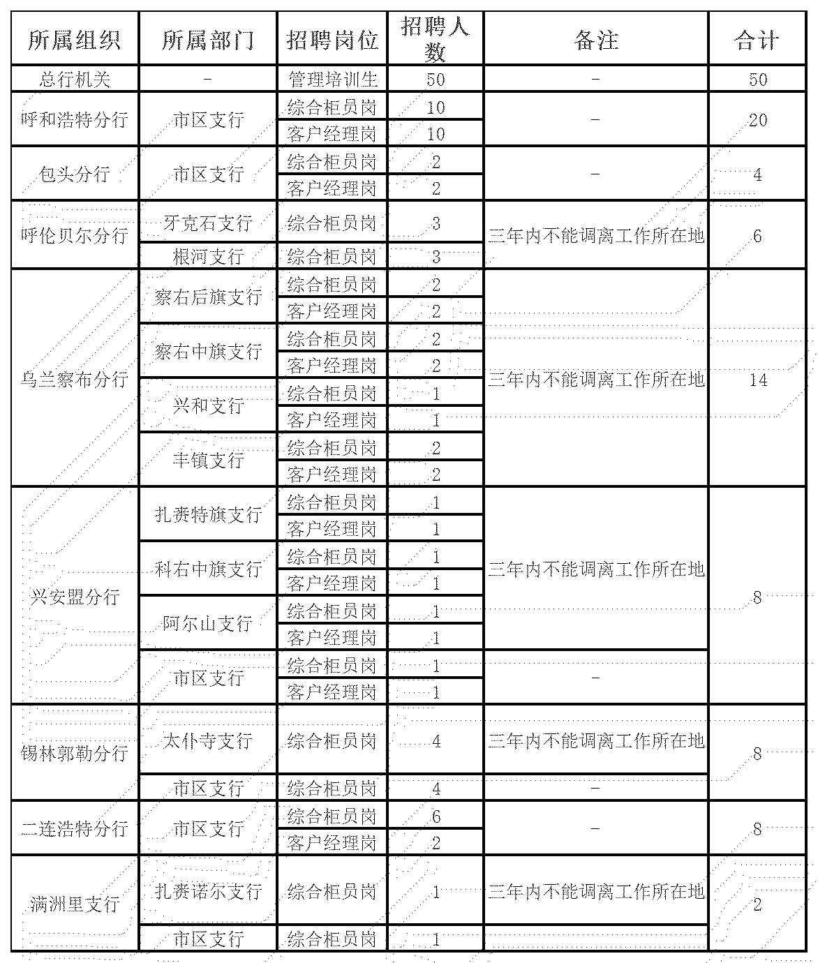管理培訓(xùn)生50人,客戶經(jīng)理、綜合柜員70人,共120人。具體招聘崗位及工作地點(diǎn)見下表。