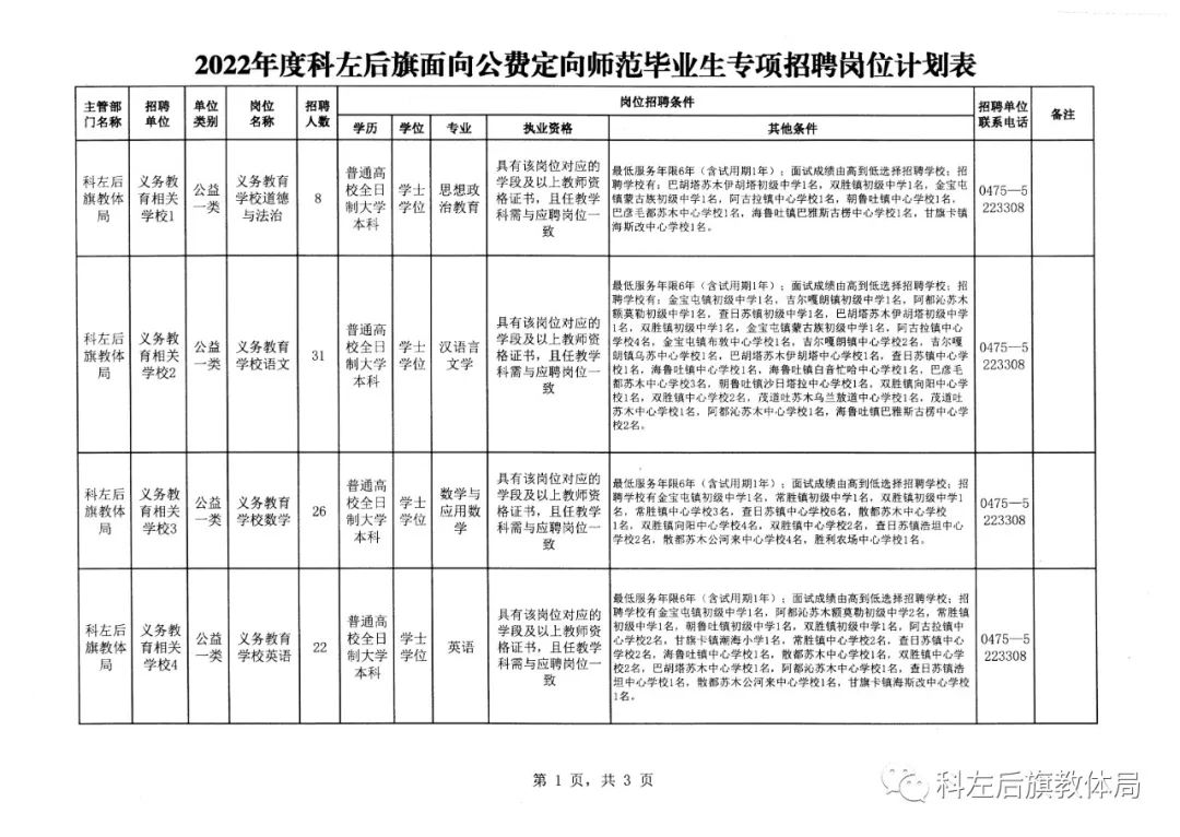 為做好2022年公開招聘工作,按照《2022年度科左后旗面向公費定向師范畢業(yè)生專項招聘工作實施方案》和用人單位實際需要,制定本公告。