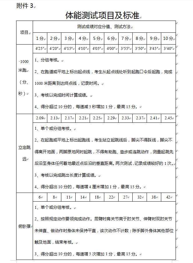 2.測試內(nèi)容:體能考核包括1000米跑、俯臥撐、立定跳遠、10米*4往返(詳見附件3體能標(biāo)準(zhǔn))。實行量化評分,單項有效成績?yōu)?-15分(未取得有效成績的不予以招錄)。報考人員本人應(yīng)正確判斷參加體能測試可能發(fā)生的后果,自愿選擇是否參加體能測試,因參加測試的報考人員本人發(fā)生誤判,導(dǎo)致在參加體能測試時造成本人受傷等不利后果的,責(zé)任由參加測試的報考人員本人自負。