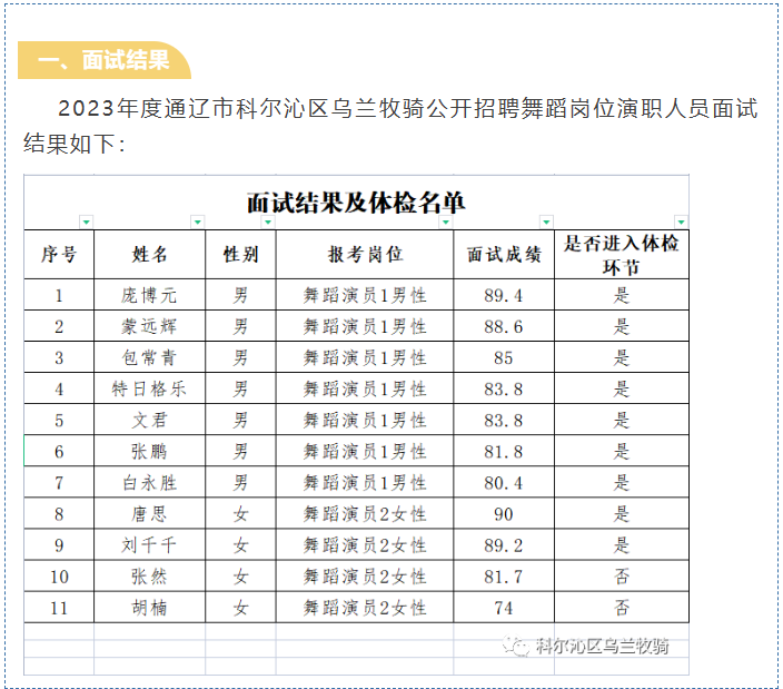 2023年度通遼市科爾沁區(qū)烏蘭牧騎公開招聘舞蹈崗位演職人員面試結(jié)果如下: