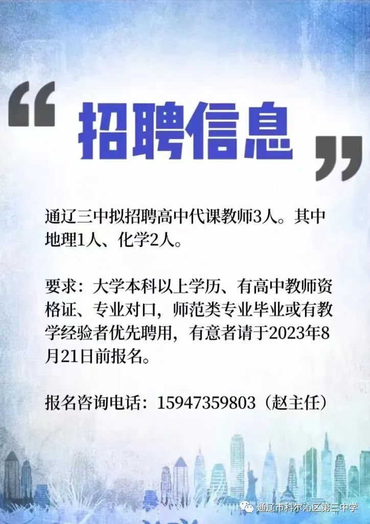 通遼三中擬招聘高中代課教師3人,地理1人、化學2人。
