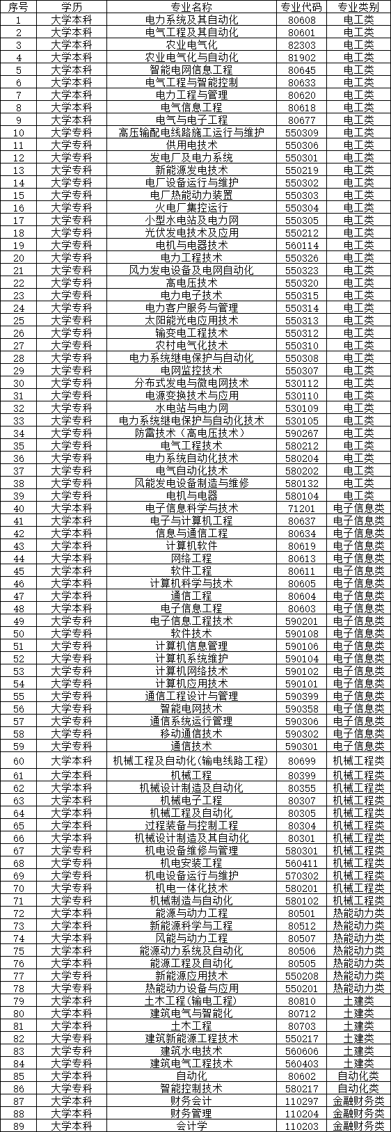 電工類、電子信息類、機械工程類、熱能動力類、自動化類、土建類等專業(yè)大學(xué)專科及以上學(xué)歷,財務(wù)類專業(yè)大學(xué)本科學(xué)歷,具有軍隊服役經(jīng)歷者優(yōu)先考慮,以上學(xué)歷和專業(yè)以全日制最高學(xué)歷、主修專業(yè)為準,具體如下。