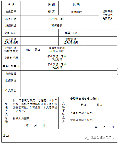 扎魯特旗人民醫(yī)院2023年公開招聘合同制護理人員報名表