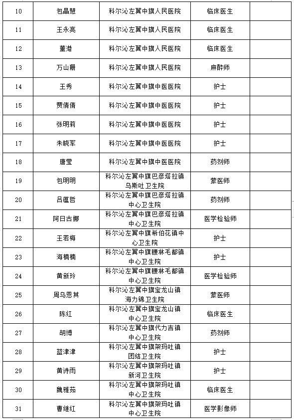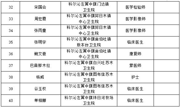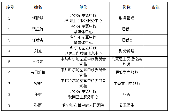 根據(jù)《2024年第一批次科左中旗事業(yè)單位公開(kāi)招聘工作人員公告》要求,經(jīng)過(guò)報(bào)名、資格初審、筆試、資格復(fù)審、面試(試講)、體檢、考察等環(huán)節(jié),現(xiàn)對(duì)何斯琴等40名擬聘用人員予以公示。公示時(shí)間為2024年1月15日至1月19日。公示期間如對(duì)公示情況有異議,請(qǐng)署名實(shí)事求是反映問(wèn)題并提供必要的調(diào)查線索及相關(guān)證明材料。