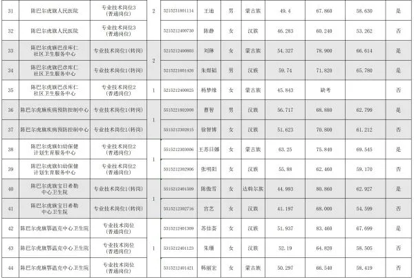 根據(jù)《內(nèi)蒙古自治區(qū)2024年度事業(yè)單位公開招聘工作人員公告》有關(guān)要求,現(xiàn)將2024年度陳巴爾虎旗事業(yè)單位公開招聘衛(wèi)生專業(yè)技術(shù)人員考試總成績公布如下: